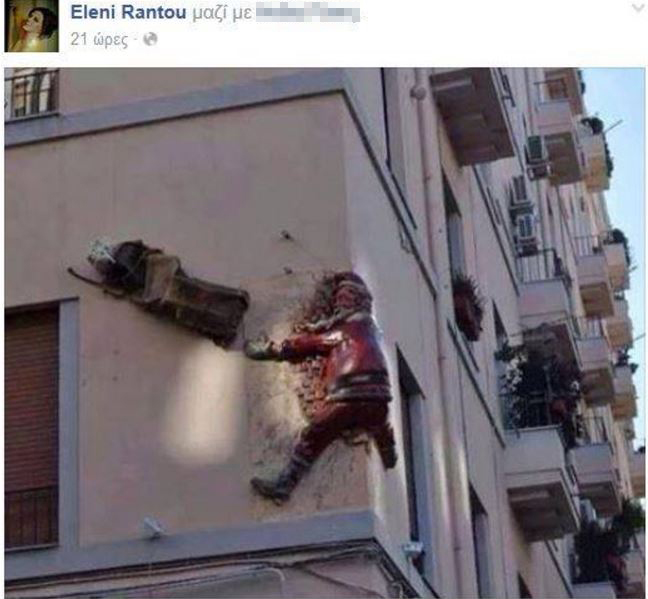Η Ελένη Ράντου ανέβασε μια φωτογραφία στην προσωπική της σελίδα στο Facebook, που δείχνει τον Άγιο Βασίλη να έχει γίνει… χαλκομανία στον τοίχο μιας πολυκατοικίας. Αξίζει να σημειωθεί ότι περισσότεροι από 1.000 διαδικτυακοί φίλοι της δημοφιλούς ηθοποιού κοινοποίησαν τη φωτογραφία, η οποία ξεπέρασε τα 13.000 like.