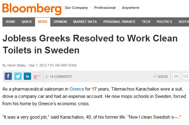 Επί 17 χρόνια ο Τηλέμαχος Καραχάλιος ζούσε στην Ελλάδα, φορούσε κοστούμι, οδηγούσε εταιρικό αυτοκίνητο και εργαζόταν για φαρμακευτική εταιρεία. Είχε όλες τις απολαβές που μπορεί να έχει ένα στέλεχος μια τέτοιας εταιρείας. Τώρα, καθαρίζει τουαλέτες σχολείων στην Σουηδία αφού αναγκάστηκε να εγκαταλείψει την χώρα του λόγω οικονομικής κρίσης.”Ήταν μια πολύ καλή δουλειά”, λέει ο 40χρονος Έλληνας. “Τώρα καθαρίζω τις ακαθαρσίες των Σουηδών”. Ο Τηλέμαχος Καραχάλιος άφησε την 6χρονη κόρη του να την μεγαλώσουν οι γονείς του στην Ελλάδα και όπως γράφει το Bloomberg είναι ένας από εκείνους που συγκαταλέγονται στο ιλιγγιώδες 24,4% ποσοστό ανεργίας που παρόμοιό του δεν έχουμε ξαναδεί στην χώρα μας.Η Bloomberg τονίζει πως ο αριθμός των Ελλήνων που ζήτησαν δουλειά στην Σουηδία, διπλασιάστηκε από το 2010.