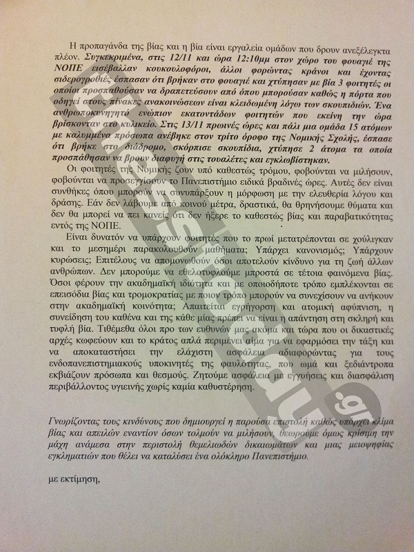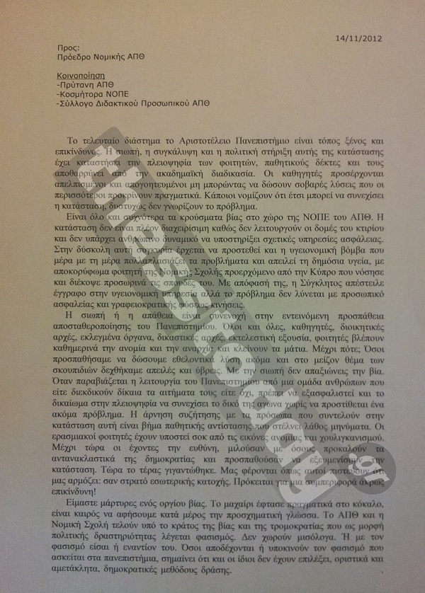 Τα φαινόμενα βίας φαίνεται να έχουν γίνει “καθημερινότητα” στους χώρους του ΑΠΘ και είναι ενδεικτική επιστολή-φωτιά που συνέταξαν φοιτητές προς τον πρόεδρο της Νομικής σχολής και που εξασφαλίσαμε αποκλειστικά, παρουσιάζοντας την παρακάτω.