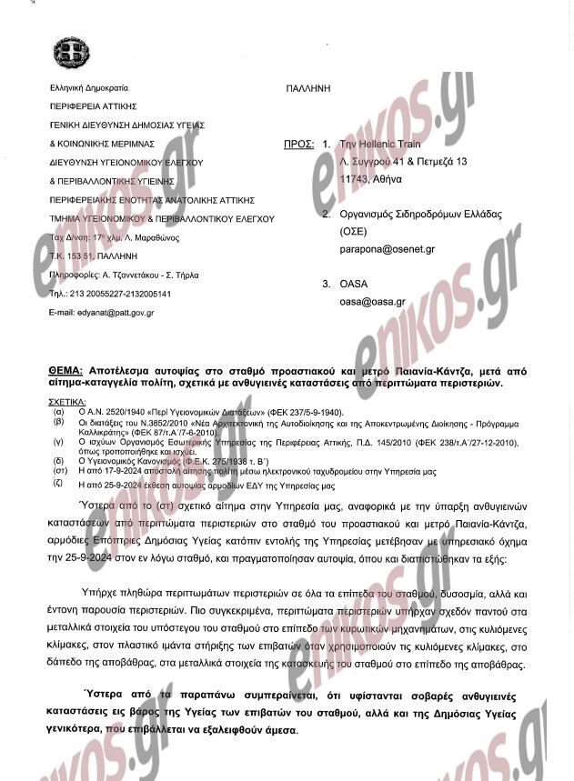 Μετά την αυτοψία, η αρμόδια υπηρεσία της Περιφέρειας απάντησε στην καταγγελία του κ. Καραγεώργου ενημερώνοντας για τα ευρήματα των ειδικών. Αναλυτικά, όπως ανέφερε και φαίνεται στο παρακάτω έγγραφο, «ύστερα από σχετικό αίτημα στην Υπηρεσίας μας, αναφορικά με την ύπαρξη ανθυγιεινών καταστάσεων από περιττώματα περιστεριών στον σταθμό προαστιακού και μετρό Παιανία – Κάντζα, αρμόδιες Επόπτριες Δημόσιας Υγείας κατόπιν εντολής της Υπηρεσίας μετέβησαν με υπηρεσιακό όχημα την 25-09-2024 στον εν λόγω σταθμό, και πραγματοποίησαν αυτοψία, όπου και διαπίστωσαν τα εξής:
