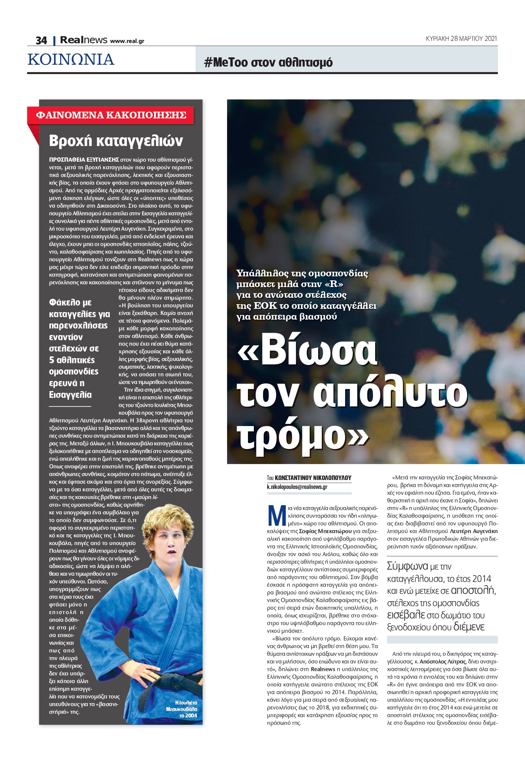 «Μετά την καταγγελία της Σοφίας Μπεκατώρου, βρήκα τη δύναμη και κατήγγειλα στις Αρχές τον εφιάλτη που έζησα. Για εμένα, ήταν καθοριστική η αρχή που έκανε η Σοφία», δηλώνει στην «R» η υπάλληλος της Ελληνικής Ομοσπονδίας Καλαθοσφαίρισης, η υπόθεση της οποίας έχει διαβιβαστεί από τον υφυπουργό Πολιτισμού και Αθλητισμού Λευτέρη Αυγενάκη στον εισαγγελέα Πρωτοδικών Αθηνών για διερεύνηση τυχόν αξιόποινων πράξεων.