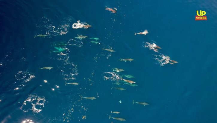 Η ομάδα του UpStories κατέγραψε το εντυπωσιακό θέαμα με drone αναφέροντας πως πρόκειται για το μεγαλύτερο κοπάδι δελφινιών που έχει καταγραφεί στην Ελλάδα με χρήση Drone.