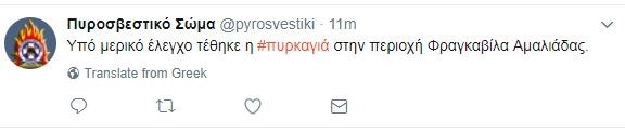 Η πυρκαγιά εκδηλώθηκε από άγνωστη μέχρι τώρα αιτία, σε αγροτοδασική έκταση. Σύμφωνα με το γραφείο Τύπου της Πυροσβεστικής στο σημείο επιχειρούσαν 22 πυροσβέστες με 11 οχήματα, μια ομάδα πεζοπόρο τμήμα και ένα όχημα ΟΤΑ, ενώ οι επίγειες δυνάμεις ενισχύθηκαν και με ένα καναντέρ.Δείτε το tweet της Πυροσβεστικής: