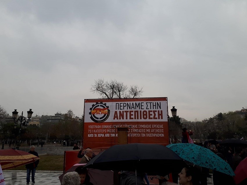Οι διαδηλωτές εκφράζουν την πλήρη αντίθεσή τους και ζητούν από την κυβέρνηση να αποσύρει άμεσα το πολυνομοσχέδιο «που τσακίζει το δικαίωμα στην απεργία και φέρνει επέκταση των πλειστηριασμών».