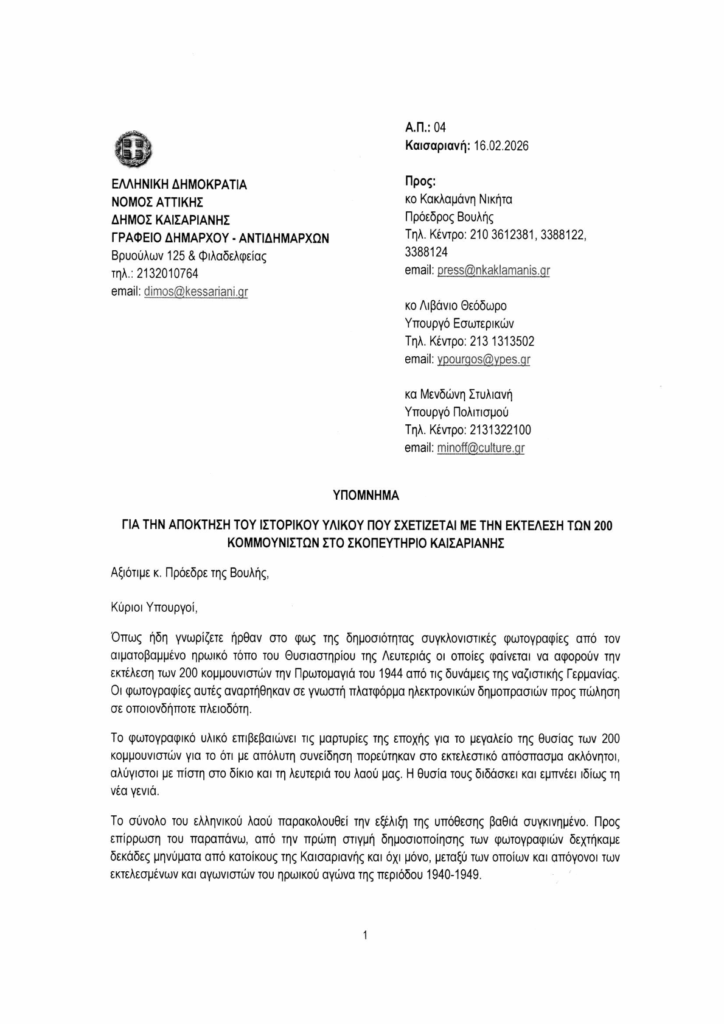 Υπόμνημα στον πρόεδρο της Βουλής και στους Υπουργούς Εσωτερικών και Πολιτισμού, με το οποίο αιτείται την απόκτηση και την απόδοση των φωτογραφιών των 200 κομμουνιστών που εκτελέστηκαν από τις ναζιστικές δυνάμεις κατοχής την Πρωτομαγιά του 1944 στο Σκοπευτήριο, κατέθεσε ο δήμαρχος Καισαριανής.