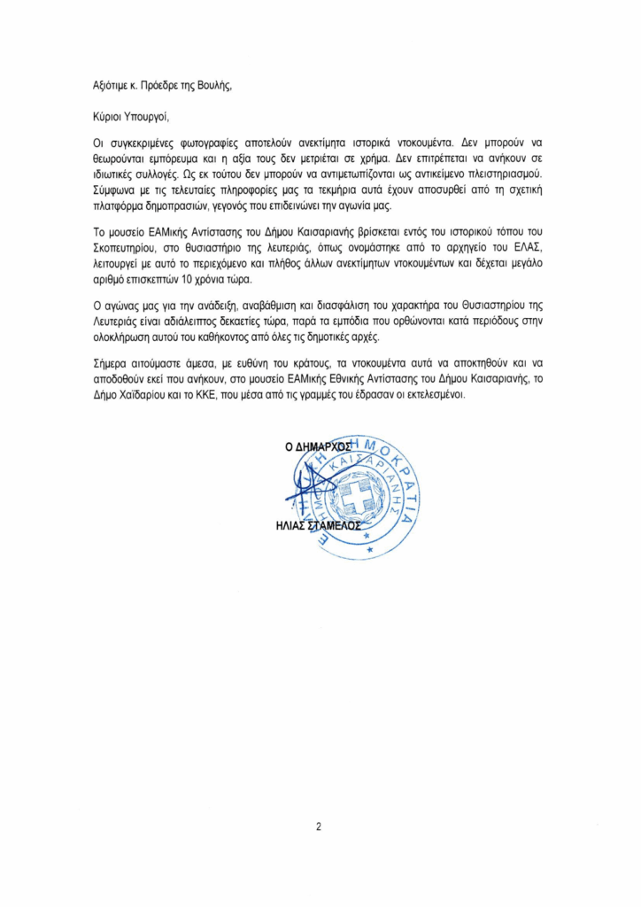 «Σήμερα αιτούμαστε άμεσα, με ευθύνη του κράτους, τα ντοκουμέντα αυτά να αποκτηθούν και να αποδοθούν εκεί που ανήκουν, στο μουσείο ΕΑΜικής Εθνικής Αντίστασης του Δήμου Καισαριανής, το Δήμο Χαϊδαρίου και το ΚΚΕ, που μέσα από τις γραμμές του έδρασαν οι εκτελεσμένοι», επισημαίνεται στο υπόμνημα του δημάρχου Καισαριανής, Ηλία Σταμέλη.