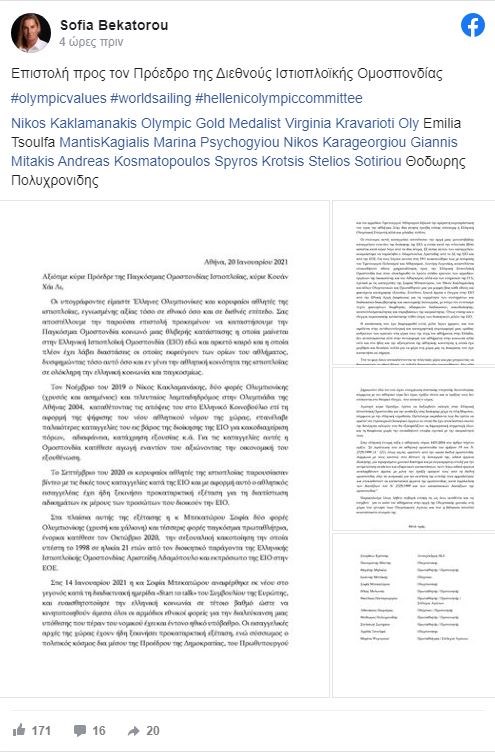 Στην δημοσιότητα έδωσε η Σοφία Μπεκατώρου, μέσω ανάρτησης στα social media, την επιστολή των Ελλήνων Ολυμπιονικών προς τον πρόεδρο της παγκόσμιας ομοσπονδίας ιστιοπλοΐας, Κουάν Χαι Λι.