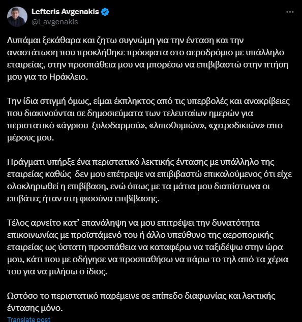 Ο κ. Αυγενάκης, μετά την δημοσιοποίηση του επεισοδίου και σχετικού βίντεο, είχε ζητήσει δημοσίως συγγνώμη υποστηρίζοντας, εξ αρχής ότι υπήρξε μόνον λεκτική ένταση.