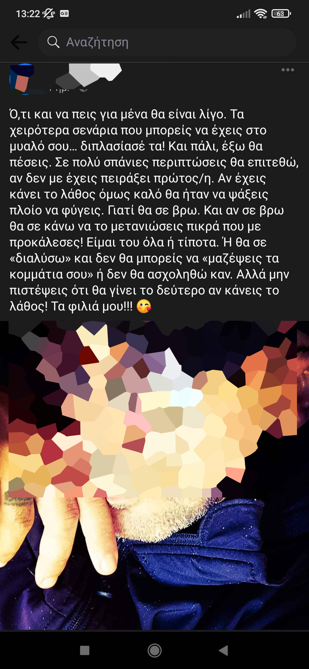 «Το κείμενο της ανάρτησης αυτής απεστάλη, με SMS, από άγνωστο αριθμό στο κινητό τηλέφωνο της Ε, θύματος του εν λόγω καταδικασθέντος αστυνομικού. Το απειλητικό αυτό μήνυμα ελήφθη και αφορά την Ε, την Χ, επίσης θύμα αυτού, τις συνηγόρους τους και όλους τους ανθρώπους που τις στήριξαν στον αγώνα τους για δικαίωση ενάντια στον βασανιστή τους. Η Δικαιοσύνη, που του χορήγησε ελαφρυντικό καλής συμπεριφοράς μετά την πράξη(!) έκρινε ότι ο άνθρωπος αυτός μπορεί να κυκλοφορεί ελεύθερος μέχρι το Εφετείο. Τα θύματα του κρύβονται, σε εναλλασσόμενα καταλύματα και δεν κυκλοφορούν στο δρόμο…», επισημαίνουν οι δικηγόροι και προσθέτουν: «Ποτέ δεν ήταν πιο μακριά η Δικαιοσύνη από το δίκαιο. Σήμερα, με την εν λόγω ανάρτηση, ο θύτης ανακοινώνει- επιβεβαιώνει ότι δεν είναι ακίνδυνος για τα θύματα του. Ότι είναι ύποπτος για την τέλεση νέων αδικημάτων εναντίον τους και η απόφαση της απελευθέρωσης του ήταν λανθασμένη. Η Δικαιοσύνη οφείλει να αναλάβει την ευθύνη της γι’ αυτό και η Πολιτεία να προστατεύσει τα θύματα του».