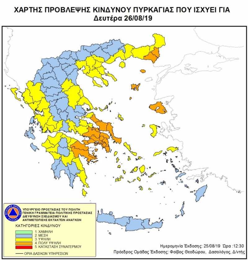 Ειδικότερα, σύμφωνα με τον χάρτη πρόβλεψης κινδύνου προβλέπεται πολύ υψηλός κίνδυνος και συγκεκριμένα κατηγορία κινδύνου 4, πρόκειται για τις Περιφέρειες Αττικής, Στερεάς Ελλάδας (Εύβοια, Βοιωτία), Πελοποννήσου (Κορινθία, Αργολίδα), Ανατολικής Μακεδονίας και Θράκης (Έβρος, Σαμοθράκη), καθώς και Βορείου Αιγαίου (Λήμνος, Μυτιλήνη).