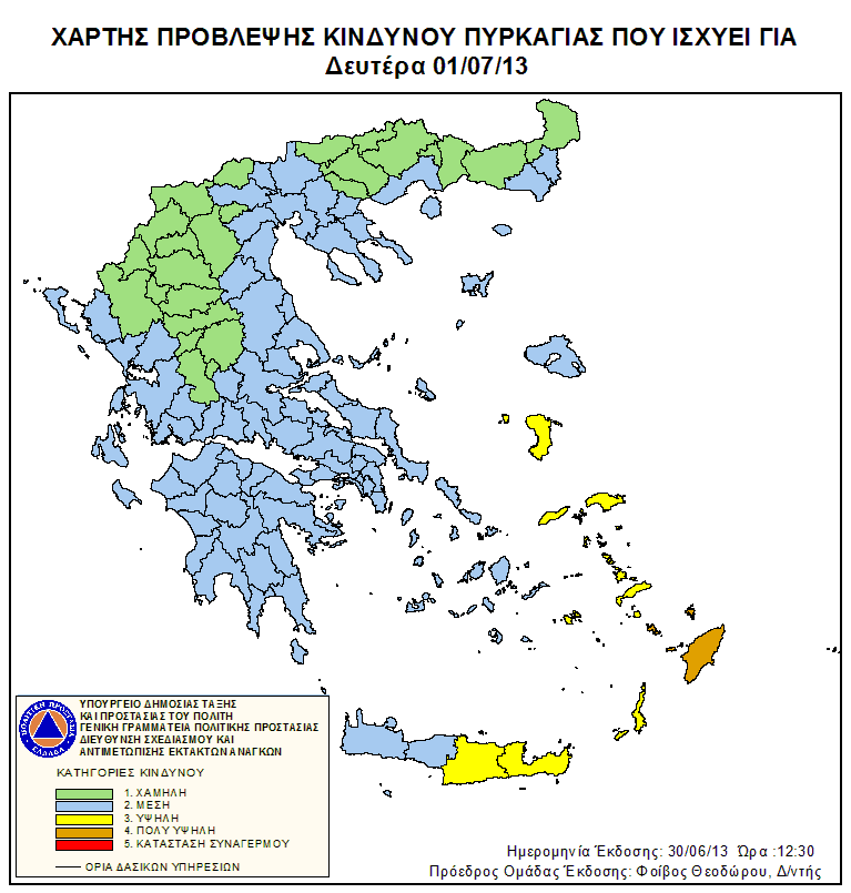 Σύμφωνα με το Χάρτη Πρόβλεψης Κινδύνου Πυρκαγιάς που εκδίδει η Γενική Γραμματεία Πολιτικής Προστασίας του Υπουργείου Δημόσιας Τάξης και Προστασίας του Πολίτη, για σήμερα Δευτέρα 1 Ιουλίου 2013, προβλέπεται πολύ υψηλός κίνδυνος πυρκαγιάς (κατηγορία κινδύνου 4) για την Περιφερειακή Ενότητα Δωδεκανήσου και ειδικότερα για τις περιοχές: