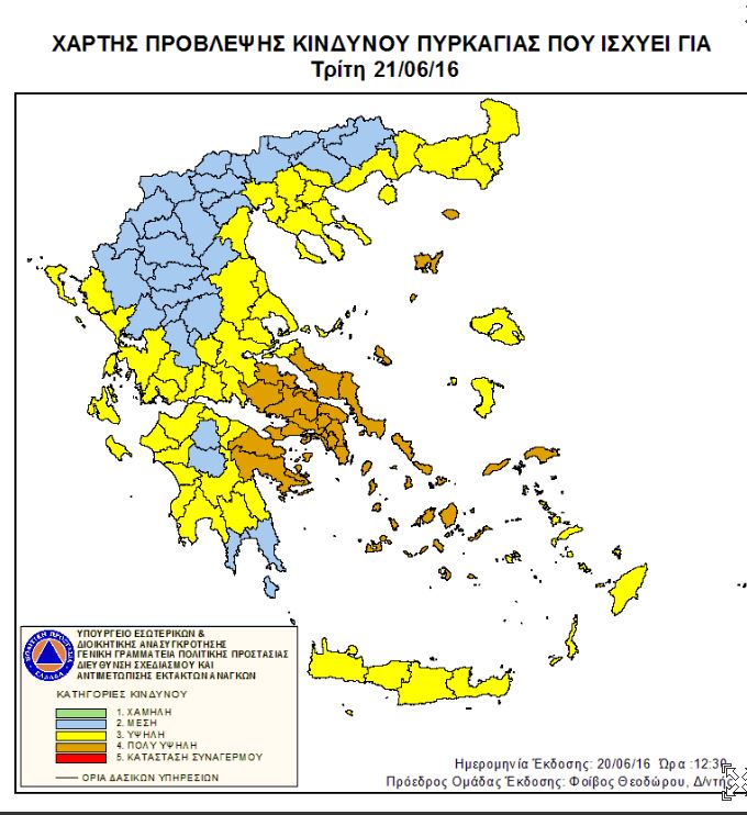 Σε επιφυλακή έχουν τεθεί οι πυροσβεστικές δυνάμεις στην Ελλάδα, λόγω του κινδύνου εκδήλωσης πυρκαγιών, από τους ανέμους και τις υψηλές θερμοκρασίες, όπως καταγράφεται στον Χάρτη Πρόβλεψης Κινδύνου Πυρκαγιάς, που εξέδωσε η Γενική Γραμματεία Πολιτικής Προστασίας.