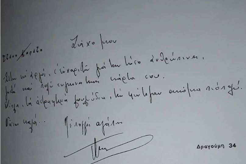 Tο χειρόγραφο σημείωμα της Τζένης Καρέζη στον Ζάχο Χατζηφωτίου