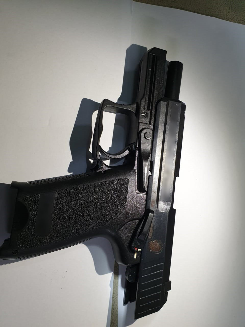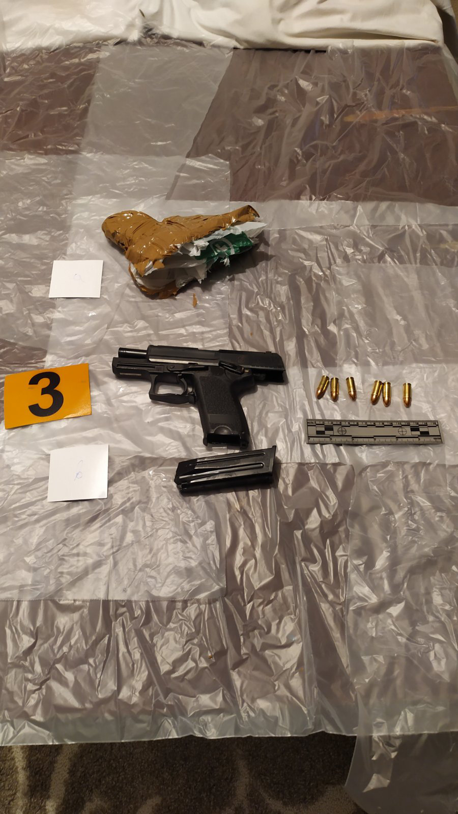 Κατά τη διάρκεια της ανωτέρω επιχείρησης διενεργήθηκε έρευνα σε οικία στην οποία βρέθηκαν και κατασχέθηκαν δυο εύχρηστα πιστόλια των 9 mm με γεμιστήρες και οκτώ (8) φυσίγγια των 9 mm .