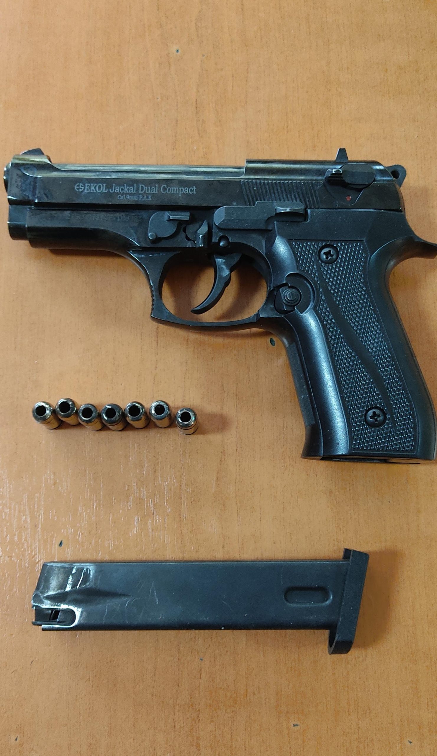 Στην κατοχή ενός εκ των συλληφθέντων, βρέθηκε και κατασχέθηκε πιστόλι κρότου και 7 κάλυκες. Οι συλληφθέντες, με τη δικογραφία που σχηματίστηκε σε βάρος τους, οδηγήθηκαν στον κ. Εισαγγελέα Πρωτοδικών Αθηνών.