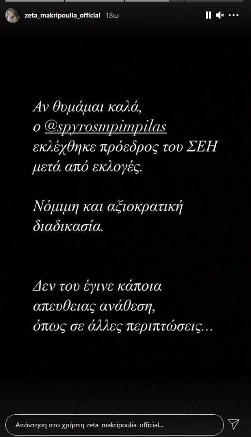 “Αν θυμάμαι καλά ο Σπύρος Μπιμπίλας εκλέχθηκε Πρόεδρος του ΣΕΗ μετά από εκλογές. Νόμιμη και αξιοκρατική διαδικασία. Δεν του έγινε κάποια απευθείας ανάθεση όπως σε άλλες περιπτώσεις…”, έγραψε η Ζέτα Μακρυπούλια.