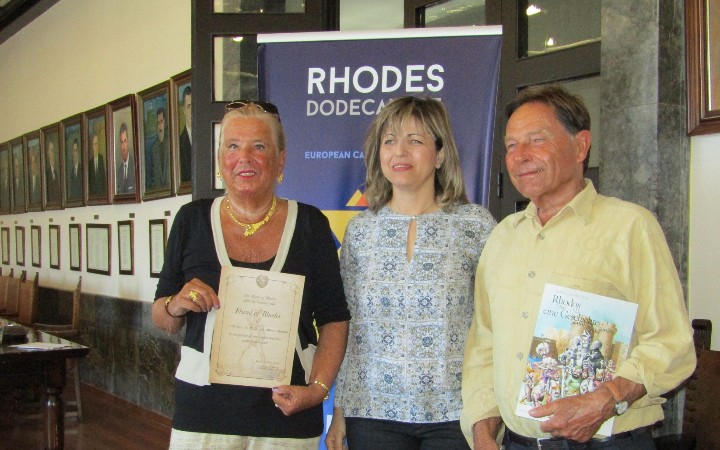 Το ζευγάρι των Γερμανών τιμήθηκε με ειδικό τιμητικό έπαινο που παρέλαβε από τον δήμαρχο Ρόδου, Φώτη Χατζηδιάκο, και την αντιδήμαρχο Τουρισμού, Διεθνών Σχέσεων και Απόδημων Ροδίων Μαρίζα Χατζηλαζάρου, καθώς φέτος βρίσκεται στη Ρόδο για 65η φορά.
