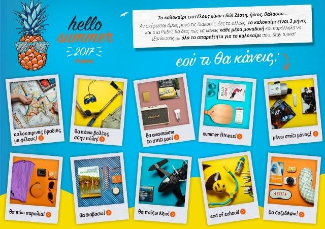 Τα Public, η νούμερο 1 ελληνική αλυσίδα καταστημάτων τεχνολογίας και ψυχαγωγίας με 53 καταστήματα σε Ελλάδα και Κύπρο, καλωσορίζει το καλοκαίρι του 2017 με το Public Summer. Επειδή το καλοκαίρι δεν είναι μόνο οι δύο εβδομάδες των διακοπών, αλλά 90 μέρες γεμάτες στιγμές που πρέπει να τις ζούμε όπως τους αρμόζει, τα Public αγκαλιάζουν την καλοκαιρινή περίοδο και σας προσκαλούν να γνωρίσετε το public.gr/summerΤο Public Summer είναι μια ολοκληρωμένη online πρόταση, για να σχεδιάσετε ένα όμορφο και χαλαρό καλοκαίρι, να ενημερωθείτε και να ικανοποιήσετε κάθε επιθυμία σας. Στο ειδικά διαμορφωμένο microsite του Public, public.gr/summer, θα ανακαλύψετε προτάσεις ανάλογα με το τι θα κάνετε, πού θα ταξιδέψετε ή με ποιο μέσο θα μετακινηθείτε, ενώ παράλληλα μπορείτε να επιλέξετε τον κατάλληλο εξοπλισμό, που ταιριάζει με τα ενδιαφέροντά σας.