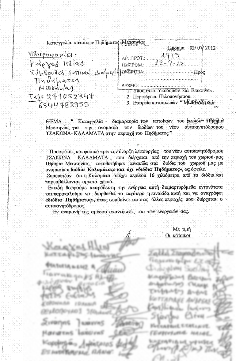 Οι κάτοικοι του χωριού έστειλαν επιστολή στο υπουργείο Υποδομών, την εταιρεία που έχει αναλάβει την κατασκευή του αυτοκινητοδρόμου και την περιφέρεια Πελοποννήσου, μέσω της οποίας εκφράζουν την αντίδρασή τους για την απόφαση να ονομαστεί ο σταθμός «διόδια Καλαμάτας», ζητώντας παράλληλα, την άμεση μετονομασία του σε «διόδια Πηδήματος».