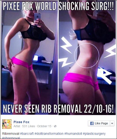 Η Πίξι Φοξ είναι μόλις 25χρονών και έχει υποβληθεί ήδη σε 15 επεμβάσεις αισθητικής, στα οπίσθιά της, στο στήθος της, στη μύτη της, στα βλέφαρα και στα φρύδια της. Η πιο παράξενη όμως επέμβασή της έγινε, όταν αφαίρεσε τα έξι της πλευρά προκειμένου να μοιάζει με έναν χαρακτήρα κινουμένων σχεδίων.
