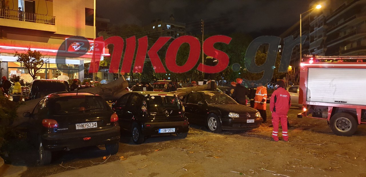 Στη Νέα Σμύρνη η ένταση του ανέμου ήταν τέτοια που δέντρο ξεριζώθηκε και καταπλάκωσε αυτοκίνητα.
