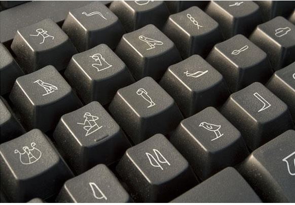 Αιγυπτιακά ιερογλυφικά σε ένα πληκτρολόγιο ή ένα συνηθισμένο σφυρί, μια πρίζα, μια ρακέτα του πινγκ-πονγκ με μια τρύπα στην μέση.