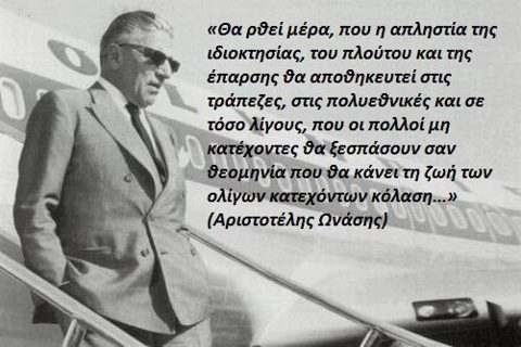 Ο Έλληνας μεγιστάνας, Αριστοτέλης Ωνάσης, διακρινόταν για το λαμπρό του μυαλό και τη διορατικότητά του που τον ανέβασαν στην κορυφή του τότε επιχειρηματικού και εφοπλιστικού κόσμου.Ο ίδιος, όπως φαίνεται από την παραπάνω δήλωσή του, είχε προβλέψει την σημερινή οικονομική «κατάντια» τόσο στη χώρα μας όσο και στον υπόλοιπο κόσμο…