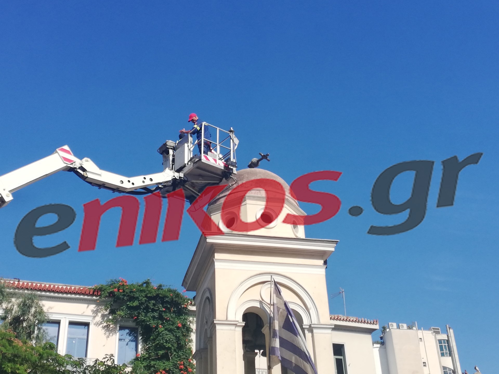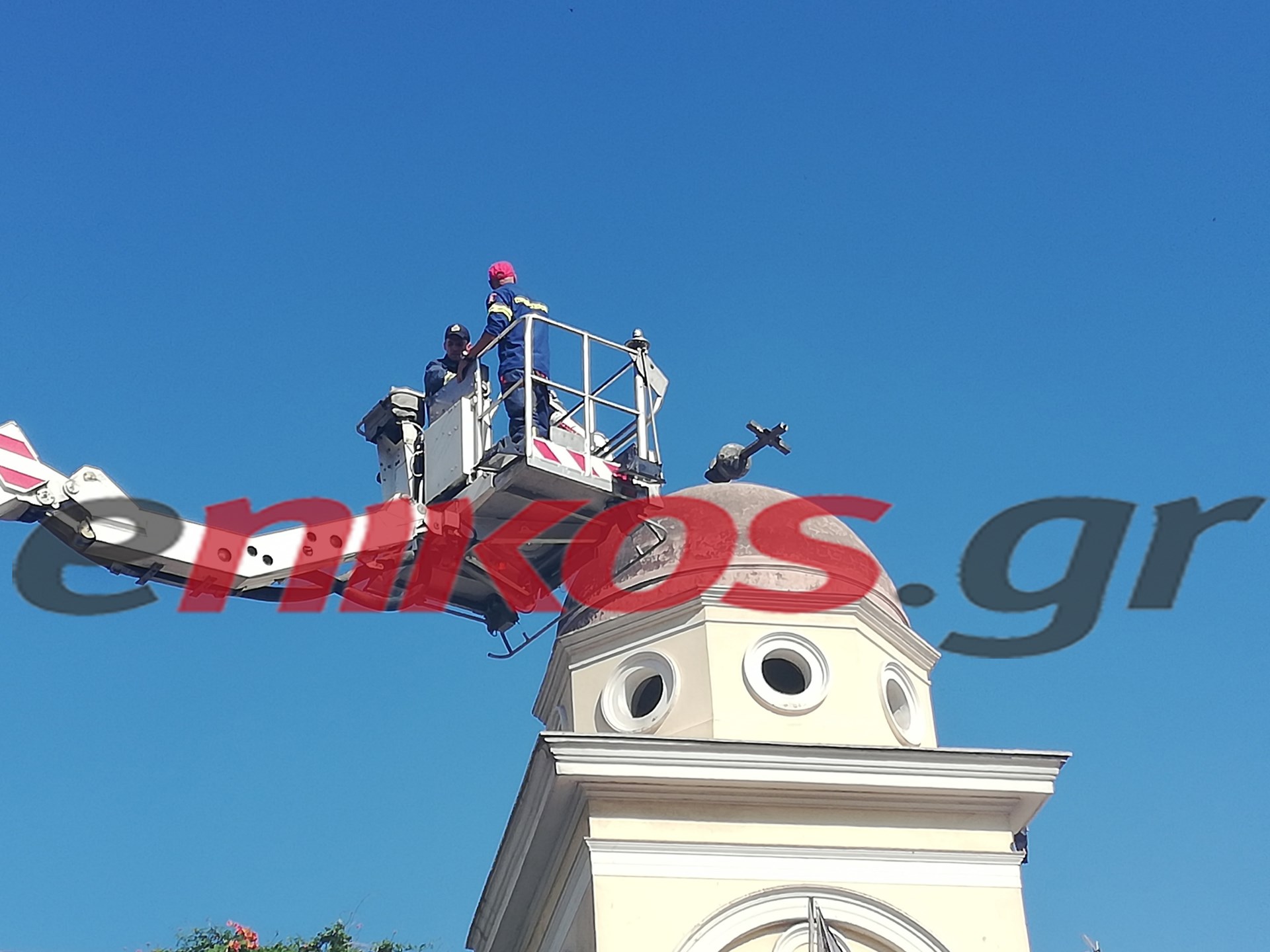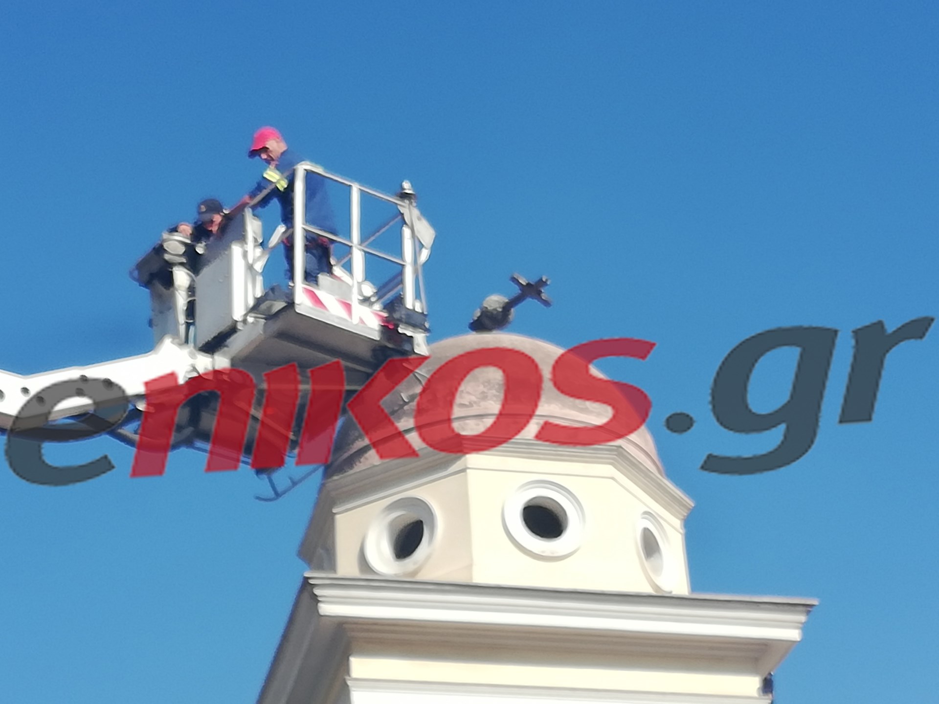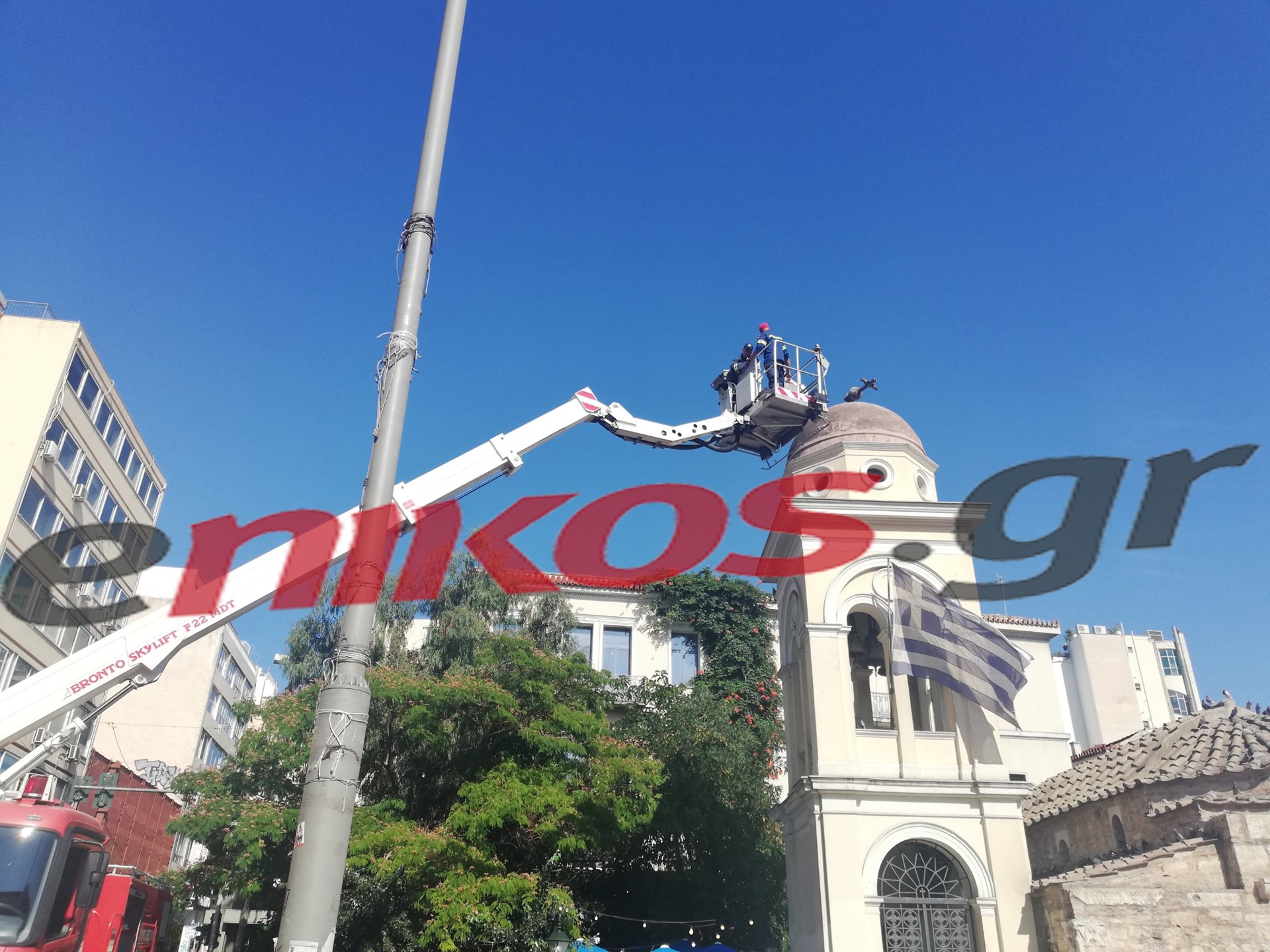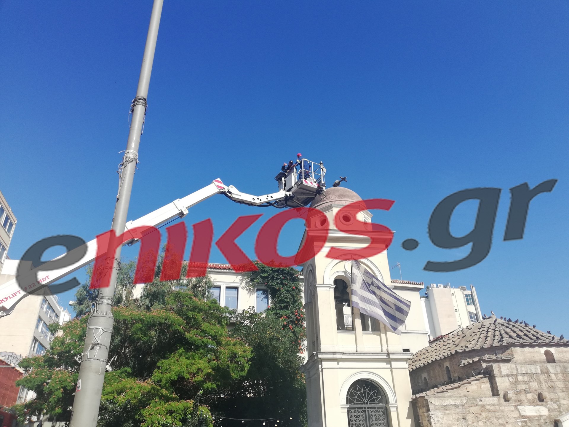 Σε εξέλιξη είναι επιχείρηση απομάκρυνσης του Σταυρού από το καμπαναριό του ιστορικού Ιερού Ναού Κοιμήσεως της Θεοτόκου στο Μοναστηράκι.