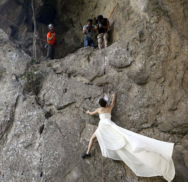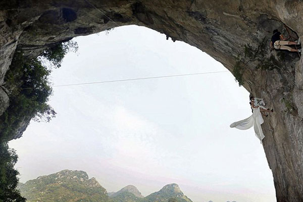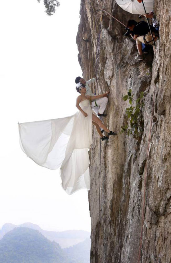 Η Fang Jing και ο σύζυγός της Lu Zhao είναι fan των extreme σπορ στη φύση και ειδικά της αναρρίχησης σε απότομες πλαγιές. Εξαιτίας αυτού του πάθους τους αποφάσισαν να τελέσουν το γάμο τους στην άκρη ενός γκρεμού και να τραβήξουν μερικές εκπληκτικές φωτογραφίες.
