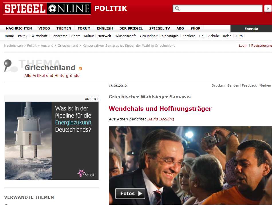 Στο περιοδικό Der Spiegel, το βασικό άρθρο για τις ελληνικές εκλογές έχει τίτλο “Νικητής των εκλογών ο Αντώνης Σαμαράς -λίγη ελπίδα”. Σημειώνεται το γεγονός ότι “η νίκη των συντηρητικών δίνει στη χώρα διαρκούς κρίσης μόνο ένα μικρό διάλειμμα, να ανασάνει”, ενώ υποστηρίζεται ότι η Ελλάδα είναι βαθιά διχασμένη και ότι οι συνομιλίες για τον σχηματισμό κυβέρνησης ξεκινούν, υπό δύσκολες συνθήκες. “Υπάρχει η απειλή για νέο χάος, αν οι Έλληνες δεν τα βρουν μεταξύ τους”, αναφέρεται. “Το ότι αυτό το χάος έχει αποφευχθεί, οριστικά, λόγω της νίκης της Νέας Δημοκρατίας, δεν μπορεί κανείς να το πιστέψει σοβαρά. Αντιθέτως, το πόσο μεγάλο θα γίνει αυτό το χάος, θα φανεί μάλλον τις επόμενες ημέρες, όταν θα έχουν τελειώσει οι συνομιλίες για τον σχηματισμό κυβέρνησης” εκτιμά ο αρθρογράφος.