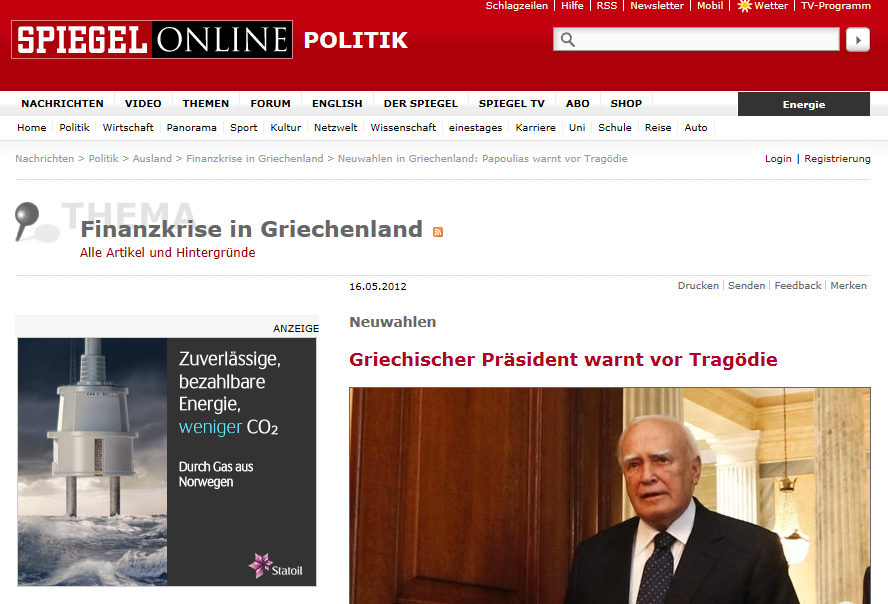 Το περιοδικό Der Spiegel παρουσιάζει τον Φρανσουά Ολάντ ως «τελευταία ελπίδα των Ελλήνων» και αναφέρεται σε προεκλογικό αγώνα της Ευρώπης στην Ελλάδα: «Άναυδοι εντελώς οι Ευρωπαίοι παρακολουθούν το πολιτικό χάος στην Ελλάδα. Οι Βρυξέλλες και το Βερολίνο θεωρούν δημοψήφισμα την εκλογική διαδικασία και θέλουν να ενισχύσουν τους υποστηρικτές του ευρώ».