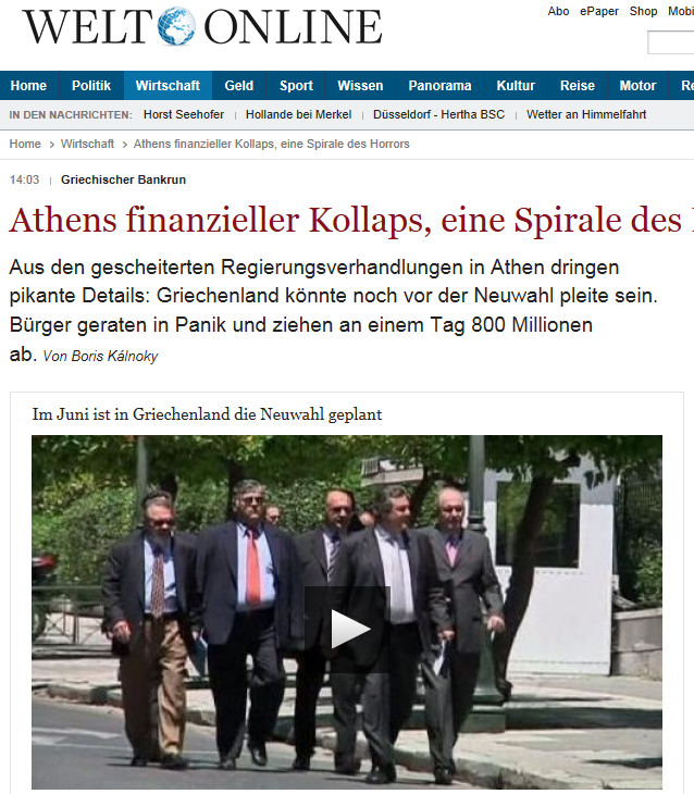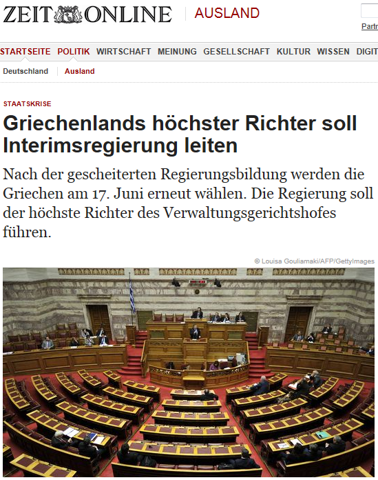 Η Die Zeit αναφέρεται σε «απόσυρση των καταθέσεων από τις τράπεζες» και σε άρθρο γνώμης τονίζει: «Η δραχμή ως Ιώβ. Πίσω στο παλιό νόμισμα; Αν η Ελλάδα εγκαταλείψει το ευρώ, θα πρόκειται για αυτοκτονία από τον φόβο για τον θάνατο». Σε άλλο δημοσίευμα, αναφέρεται: «Το πρώτο θύμα. Όλοι φταίνε για την ελληνική καταστροφή- το Βερολίνο, οι Βρυξέλλες, η Αθήνα. Πώς η Ευρωζώνη οδηγεί σε ένδεια ένα μέλος το οποίο δεν έπρεπε να έχει ενταχθεί ποτέ».