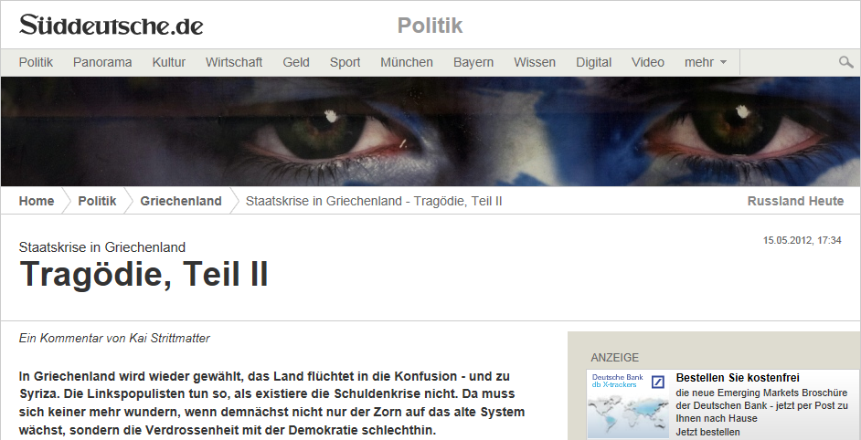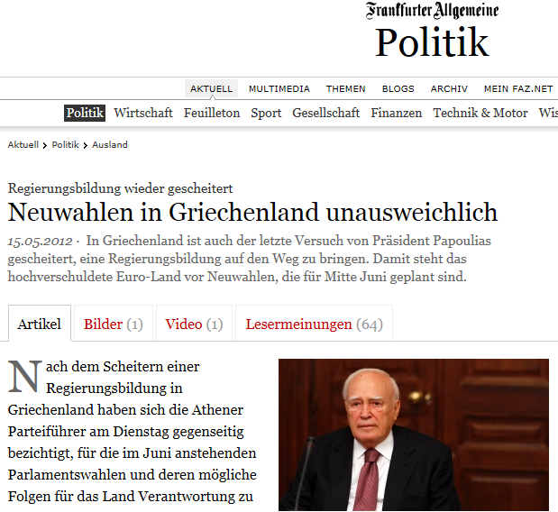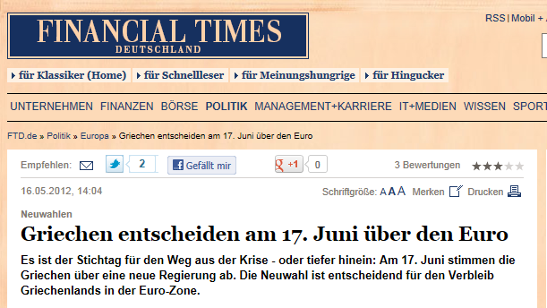 Δημοψηφισματικό χαρακτήρα για την παραμονή ή όχι της Ελλάδας στην Ευρωζώνη, αποδίδει το σύνολο των γερμανικών ΜΜΕ στις νέες ελληνικές εκλογές, οι οποίες αποτελούν και σήμερα κεντρικό ζήτημα της ειδησεογραφίας στη Γερμανία.Οι περισσότερες εφημερίδες αναδεικνύουν ακόμη το ζήτημα της ταμειακής επάρκειας της Αθήνας και των μαζικών αναλήψεων από τις ελληνικές τράπεζες. Η Sueddeutsche Zeitung δημοσιεύει ανταποκρίσεις από την Αθήνα και αναλύσεις, σημειώνοντας ότι «οι τράπεζες φέρονται να διαθέτουν ρευστότητα μόνο για τρεις εβδομάδες», ενώ αναφέρει: «Τραγωδία – μέρος β΄, νέες εκλογές, η χώρα βυθίζεται στην σύγχυση».
