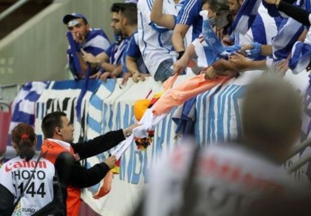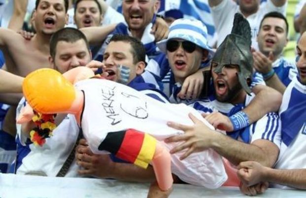 Μια ξανθιά πλαστική κούκλα με τη φανέλα της Γερμανίας, το όνομα της Mέρκελ και τον αριθμό «69», προκάλεσε ένταση στην εξέδρα του γηπέδου στο Γκντάνσκ. Η UEFA έδωσε εντολή να κατέβει από την εξέδρα καθώς ήταν σαφέστατο το … σεξουαλικό μήνυμα εις βάρος της Καγκελαρίου. Έτσι άνδρας της ασφάλειας του γηπέδου πλησίασε στο μέρος που ήταν η κούκλα και την τράβηξε παρά την προσπάθεια των Ελλήνων να την κρατήσουν στην εξέδρα, με αποτέλεσμα η κούκλα να …ξεφουσκώσει! Δείτε τις φωτογραφίες: