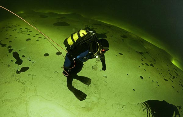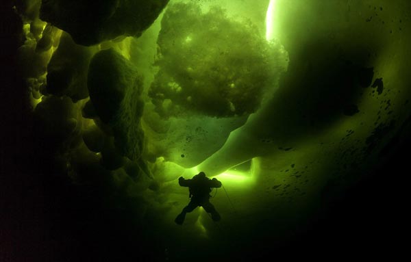 Δεμένος με ένα σχοινί, προκειμένου να μην χάσει τον προσανατολισμό του, ο Φράνκο περιηγήθηκε στα νερά, ανάμεσα στους πάγους και στους δαιδαλώδεις υποβρύχιους διαδρόμους, λαμβάνοντας εκπληκτικές εικόνες που κόβουν την ανάσα.