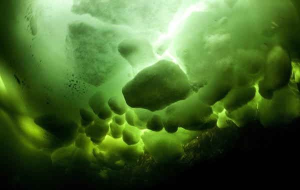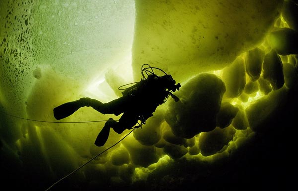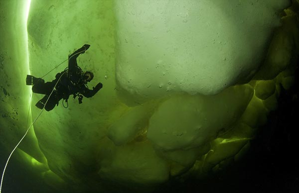Ο φωτογράφος και επαγγελματίας δύτης, Φράνκο Μπάνφι, εξερευνά τη Λευκή Θάλασσα στη βορειοδυτική ακτή της Ρωσίας. Σε βάθος δέκα μέτρων και σε θερμοκρασία νερού -2 βαθμούς Κελσίου, ο Φράνκο βούτηξε μαζί με έναν συνάδελφό του κάτω από ένα μεγάλο στρώμα πάγου και έγινε μάρτυρας εκπληκτικών χρωμάτων.