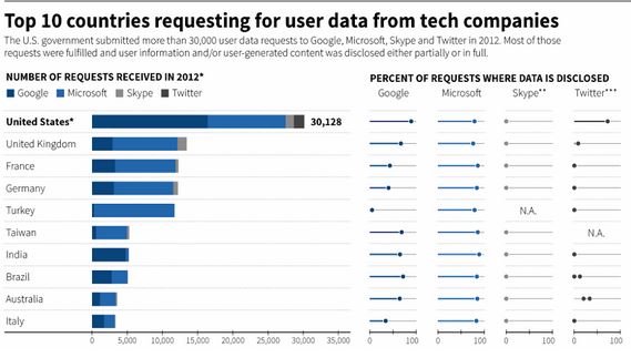 Άλλωστε, εκτός από τις ΗΠΑ πολλές είναι οι χώρες που ζητούν από τις τεχνολογικές εταιρείες να τους παρέχουν δεδομένα για τους χρήστες τους, με τρανά παραδείγματα τη Μ. Βρετανία, τη Γαλλία, τη Γερμανία, την Τουρκία και τις υπόλοιπες χώρες που παρατίθενται στην παρακάτω λίστα: