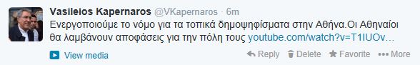 Την ενεργοποίηση του νόμου των τοπικών δημοψηφισμάτων ανακοίνωσε ο υποψήφιος δήμαρχος της Αθήνας Βασίλης Καπερνάρος στην περίπτωση που εκλεγεί. Ο κ.Καπερνάρος υποστήριξε ότι για ιδιαιτέρως σοβαρά θέματα θα πρέπει να λαμβάνουν τις αποφάσεις οι ίδιοι οι Αθηναίοι. Πριν από λίγο έκανε και την ανάλογη ανάρτηση στο twitter.