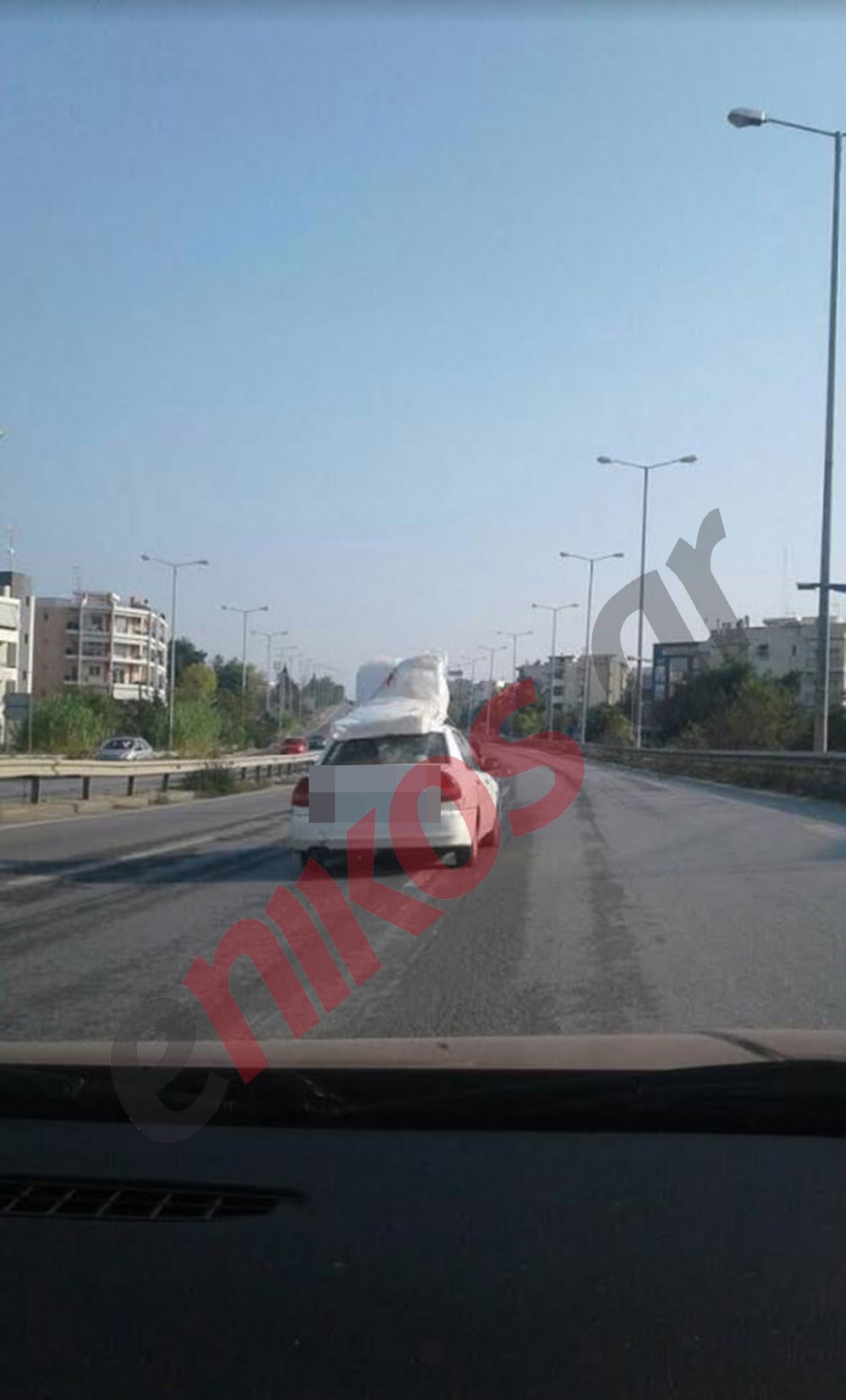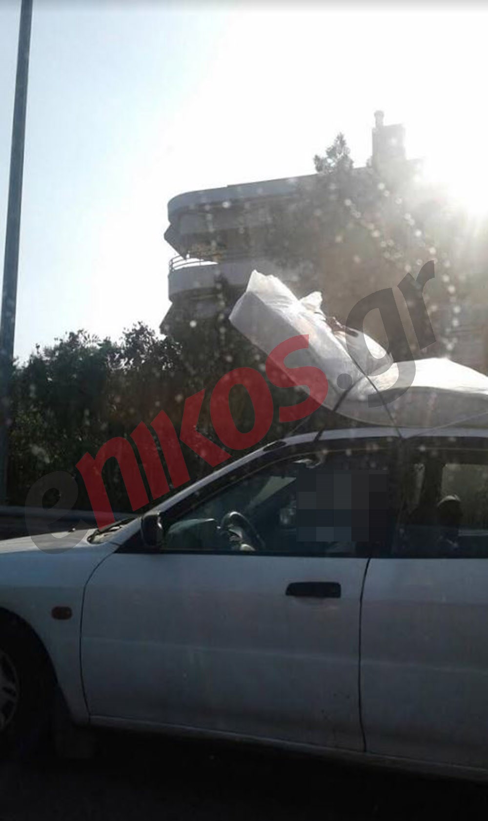 Όπως περιέγραψε αναγνώστης του enikos.gr και φαίνεται στις φωτογραφίες που έστειλε έδεσε το στρώμα στο αυτοκίνητο με ένα παιδικό αθλητικό σχοινάκι.
