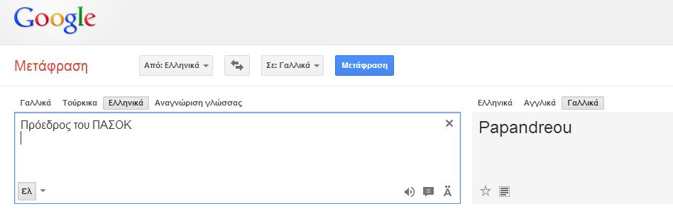 Η μηχανή αναζήτησης κάνει αντιπολίτευση στον Ευάγγελο Βενιζέλο, αλλιώς δεν μπορεί να εξηγηθεί αυτό που βγάζει, όταν στο πεδίο της μετάφρασης πληκτρολογεί κάποιος “Πρόεδρος του ΠΑΣΟΚ”.