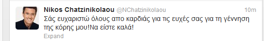 Σήμερα το πρωί ήρθε στη ζωή η κόρη του Νίκου Χατζηνικολάου και της Κρίστη Τσολακάκη. Το πρώτο tweet του Ν.Χατζηνικολάου μετά την γέννηση: