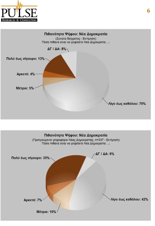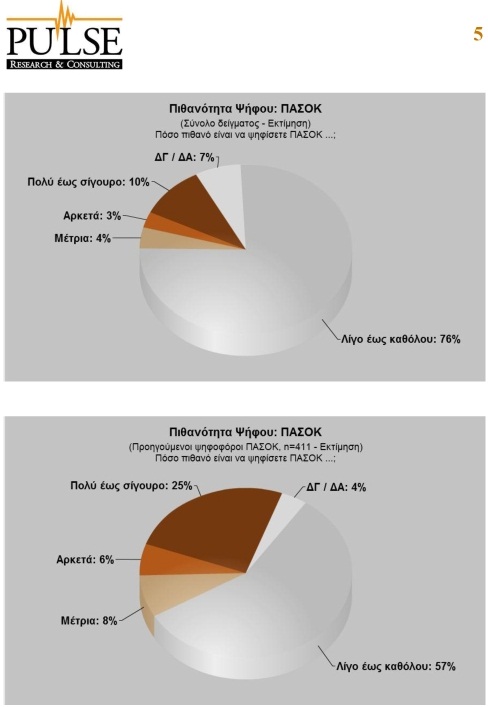 Tην “άρνηση” και τον “θυμό” των πολιτών προς τα δύο “μεγάλα” κόμματα αποτυπώνει η δημοσκόπηση της Pulse RC, που δημοσιεύεται στην εφημερίδα “Το Ποντίκι”.Κι αυτό γιατί το 70% των ερωτηθέντων απαντά ότι είναι “λίγο έως καθόλου” πιθανό να ψηφίσει ΝΔ στις εκλογές, ενώ το αντίστοιχο ποσοστό στη σχετική ερώτηση για την πιθανότητα ψήφου στο ΠΑΣΟΚ αγγίζει το 76%.Σε ότι αφορά τους “αποφασισμένους” ψηφοφόρους, είναι χαρακτηριστικό ότι μόνο το 10% δηλώνει ότι είναι πολύ πιθανό έως σίγουρο να ψηφίσει ΠΑΣΟΚ, ποσοστό που για τη ΝΔ φτάνει το 13%. Απαγοητευτικά είναι και τα ποσοστά των δύο μεγάλων κομμάτων σε ότι αφορά την πιθανότητα ψήφου ανάμεσα στους ψηφοφόρους του ΠΑΣΟΚ και της ΝΔ το 2009.Έτσι, από όσους ψήφισαν ΠΑΣΟΚ το 2009, το 57% σήμερα δηλώνει ότι είναι λίγο έως καθόλου πιθανό να ψηφίσει ΠΑΣΟΚ, ενώ μόνο το 25% των ψηφοφόρων του απαντά ότι είναι πολύ πιθανό έως σίγουρο να ξαναψηφίσει ΠΑΣΟΚ.Την ίδια στιγμή, από όσους ψήφισαν ΝΔ το 2009, το 42% σήμερα δηλώνει ότι είναι λίγο έως καθόλου πιθανό να ψηφίσει ΝΔ, με το 35% των “γαλάζιων” ψηφοφόρων να απαντά ότι είναι πολύ πιθανό έως σίγουρο να ξαναψηφίσει ΝΔ. Η έρευνα ήταν τηλεφωνική και πραγματοποιήθηκε το χρονικό διάστημα από 3 έως 9 Απριλίου.