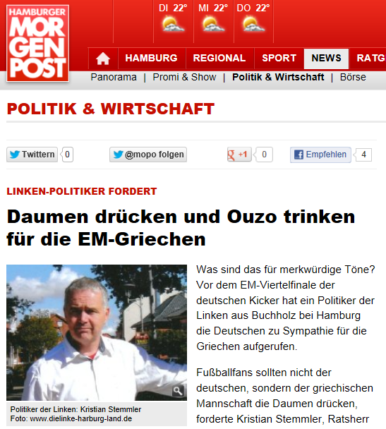 “Τι είναι πάλι ετούτο;” διερωτάται η γερμανική εφημερίδα Hamburger Morgenpost, σε δημοσίευμα σύμφωνα με το οποίο Αριστερός Γερμανός πολιτικός, ο Κρίστιαν Στέμλερ, κάνει έκκληση στους οπαδούς της Εθνικής Ομάδας της Γερμανίας, να πιουν ούζο και να τσουγκρίσουν τα ποτήρια τους στη νίκη της Εθνική Ελλάδος.