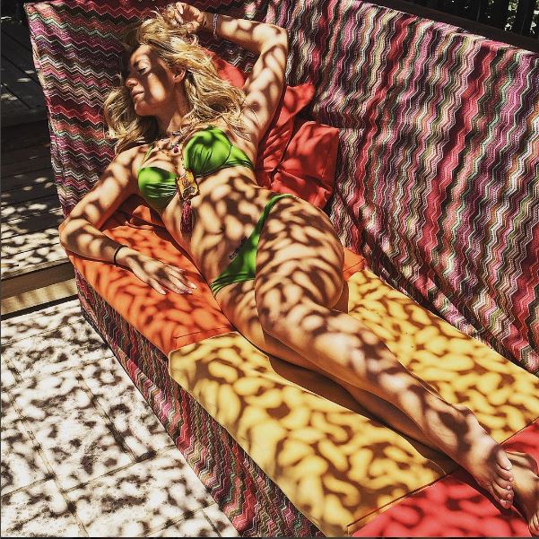 Η παρουσιάστρια είναι ξαπλωμένη φορώντας πράσινο μαγιό και απολαμβάνει τις διακοπές της.