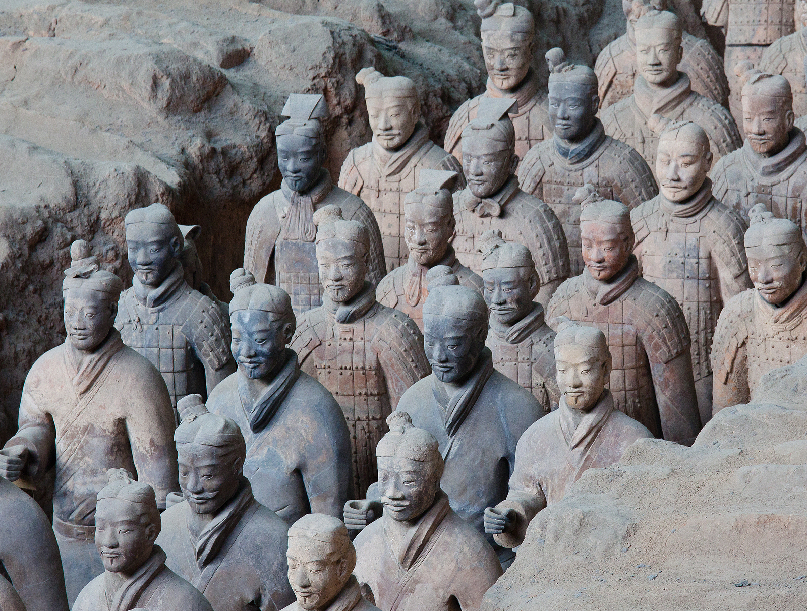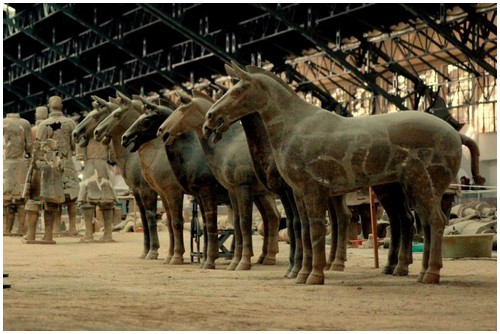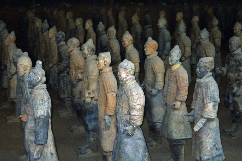 Όταν ο πρώτος αυτοκράτορας της Κίνας Τσιν Σι Χουάνγκ (221-260 π.Χ) πέθανε, θάφτηκε μαζί με εφτά χιλιάδες στρατιώτες από πηλό, δεκάδες άμαξες και άλογα. Κάθε άγαλμα έχει διαφορετικά σωματικά χαρακτηριστικά και χρωματισμό και είναι τοποθετημένο ανάλογα με το βαθμό και το ρόλο του κάθε στρατιώτη.