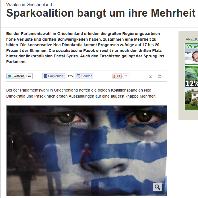 “Οι φασίστες μπαίνουν στη Βουλή”, είναι ο τίτλος της Süddeutsche Zeitung, η οποία αναφέρεται στα υψηλά ποσοστά της Χρυσής Αυγής, σημειώνοντας ότι ο ύμνος του κόμματος θυμίζει τον ύμνο της χιτλερικής νεολαίας, με θέμα “αίμα και τιμή”.