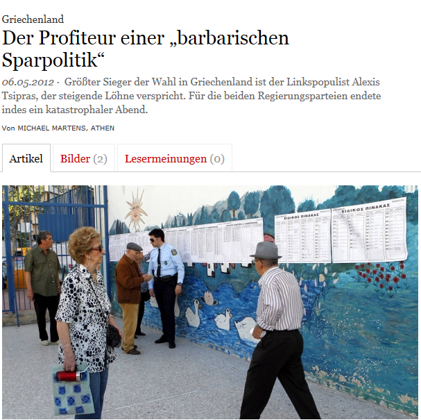 Τον κίνδυνο δυσκολίας στον σχηματισμό κυβέρνησης, αλλά και την επιστροφή των αμφιβολιών για την παραμονή της Ελλάδας στην Ευρωζώνη επισημαίνουν τα γερμανικά ΜΜΕ, τα οποία παρακολουθούν στενά την εξέλιξη του εκλογικού αποτελέσματος.Για “καταστροφικό για την Ελλάδα και την Ευρώπη”, αποτέλεσμα κάνει λόγο η Frankfurter Allgemeine Zeitung και αναφέρεται σε “μαύρα σύννεφα που κρέμονται και πάλι” πάνω από την Αθήνα. Η εφημερίδα προβλέπει δε ότι οι σημερινές εκλογές δεν ήταν οι τελευταίες και τονίζει ότι “είναι και πάλι ανοιχτό το θέμα της συμμετοχής της Ελλάδας στην Ευρωζώνη “.