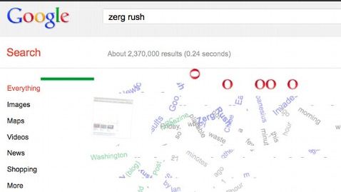Η φράση «Zerg Rush» προέρχεται από το παλιό βιντεοπαιχνίδι Starcraft, στο οποίο η φυλή των Zerg κατατροπώνει τους αντιπάλους της σε χρόνο μηδέν. Όταν κανείς εισάγει τη φράση στο Google, χρωματιστοί χαρακτήρες «ο» βομβαρδίζουν την οθόνη. Ο χρήστης μπορεί να κλικάρει τα «ο» καθώς πέφτουν πριν προλάβουν να καταστρέψουν ολόκληρη τη σελίδα.