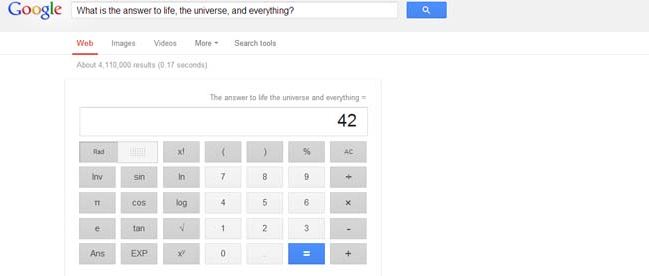 Ρωτήστε τη μηχανή «Ποια είναι η απάντηση για τη ζωή, το Σύμπαν και τα πάντα;» (What is the answer to life, the universe, and everything?). Το Google υπολογίζει όλες τις παραμέτρους και δίνει τη μόνη σωστή απάντηση: 42.