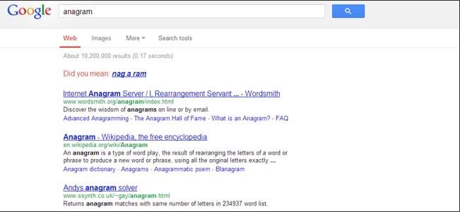 Αν εισάγετε τη λέξη anagram («αναγραμματισμός»), το Google θα σας ρωτήσει αν εννοείτε «nag a ram».